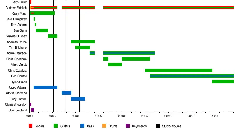 The group has released three original studio albums: First and Last and Always (1985), Floodland (1987), and Vision Thing (1990). Each album was recorded by a different line-up; singer-songwriter Andrew Eldritch and the drum machine called Doktor Avalanche are the only points of continuity throughout. Eldritch and Avalanche were also involved in the Sisterhood, a side project connected with Eldritch's dispute with former members.