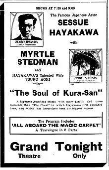 The Soul of Kura San is a lost[1] 1916 American drama silent film directed by Edward LeSaint and written by Charles Sarver. The film stars Sessue Hayakawa, Myrtle Stedman, Tsuru Aoki, George Webb, Kisaburo Kurihara and George Kuwa. The film was released on October 30, 1916, by Paramount Pictures.[2][3]