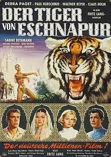The Tiger of Eschnapur, or in original German, Der Tiger von Eschnapur, is a 1959 West German-French-Italian adventure film directed by Fritz Lang.[1] It is the first of two films comprising what has come to be known as Fritz Lang's Indian Epic; the other is The Indian Tomb (Das Indische Grabmal). Fritz Lang returned to Germany to direct these films, which together tell the story of a German architect, the Indian maharaja for whom he is supposed to build schools and hospitals, and the Eurasian dancer who comes between them.