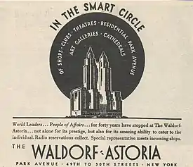 The new building opened on Park Avenue, between 49th and 50th streets, on October 1, 1931,[57] following a soft opening the previous day.[58][59] It was the tallest and largest hotel in the world at the time,[60] covering the entire block. The slender central tower became known as the Waldorf Towers, with its own private entrance on 50th Street, and consisted of 100 suites, about one-third of which were leased as private residences.[61] NBC received the exclusive right to broadcast events and music from the hotel[62] and to book live entertainment there.[63] President Herbert Hoover said on the radio, broadcast from the White House: "The opening of the new Waldorf Astoria is an event in the advancement of hotels, even in New York City. It carries great tradition in national hospitality...marks the measure of nation's growth in power, in comfort and in artistry...an exhibition of courage and confidence to the whole nation".[19] About 2,000 people were in the ballroom listening to this speech, but by the end of the business day, the 2,200-room hotel had only 500 occupants.[42]