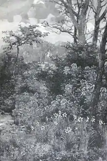Much of the estate had been managed as a coppiced woodland, giving Robinson the opportunity to plant drifts of scilla, cyclamen, and narcissus between the coppiced hazels and chestnuts. On the edges, and in the cleared spaces in the woods, Robinson established plantings of Japanese anemone, lily, acanthus, and pampas grass, along with shrubs such as fothergilla, stewartia, and nyssa. Closer to the house he had some flower beds; throughout he planted red valerian, which he allowed to spread naturally around paving and staircases.[19] Robinson planted thousands of daffodils annually, including 100,000 narcissi planted along one of the lakes in 1897. Over the years he added hundreds of trees, some of them from American friends Charles Sprague Sargent and Frederick Law Olmsted. Other features included an oval-shaped walled kitchen garden, a heather garden, and a water garden with one of the largest collections of water lilies in Europe.[20]