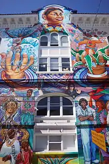 Painted by seven women artists including Juana Alicia, Miranda Bergman, Edythe Boone, Susan Kelk Cervantes (cofounder of Precita Eyes Muralists Association), Meera Desai, Yvonne Littleton and Irene Perez along with their helpers and volunteers in 1994, the mural titled MaestraPeace covers both the outside of The Women's Building as well as the interior entrance hall and stairway.[16] It features images of feminine icons from history and fiction, and the names of more than 600 women written in calligraphy.[17] According to the San Francisco Women's Center, "This spectacular mural is a culmination of a multi-cultural, multi-generation collaboration of seven women artists, and a colorful work of art that sings to our community."[2]