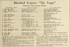 M. Winkler is the musical arranger for this film. Max Winkler, often listed as M. Winkler or Moe Winkler, was not a musician or music composer. He was a salesman for band and orchestra music. Max worked for a publishing house in New York City called Carl Fischer Music. While working as a clerk, he amassed tremendous working knowledge of thousands of pieces of music. He could recall almost in an instant. He used this knowledge to create a list of music he believed provided the film's best background music. Once the compiled list was complete, he would publish these suggestions in the form of a "Cue Sheet." Theater musicians could follow the "Winkler Cue Sheet creating the perfect musical accompaniment for the film. There is no known copy of the Cue Sheet for the Yaqui.[16]