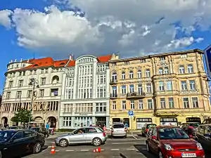 The building, realized according to the design of Fritz Weidner, housed at its time the Brandt Department store, the second one in the city, after Jedynak on Gdanska Street. The client was Max Zweininger,[8] owner of a famous hat manufactory who was living on Focha street 2. The edifice is now the headquarters of Bank Pekao SA.