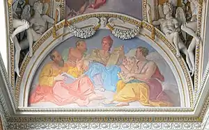 There are different interpretations for the paintings in the three lunettes. The fresco on the right side undoubtedly depicts Saint Jerome Teaching among a large group of followers. The other two are simply described by Tosini as "Sybils and Prophets" but Cynthia Stollhans proposed a more complex explanation which takes into account the historic background and the overall iconographic program of the chapel. Thus the scene above the statue is The Disputation of Saint Catherine with the Philosophers, the most famous episode from the life of the saint when she convinced 50 of the best pagan philosophers and orators about the truth of Christianity. The painting shows her in an elevated position with three philosophers reading books and immersed in deep conversation. In the background a pair of little angels appear as heavenly muses. The scene above the entrance was identified by Stollhans as Saint Catherine Teaching. This shows the saint in the middle of a small group of two helping angels, a man and a half-nude woman, all of them studying scrolls. Possibly the fresco depicts the incarcerated Catherine converting Porphyrius, the captain of the imperial guard, another well-known episode from the Golden Legend. The lunettes depict both Saint Catherine and Saint Jerome in similar roles as teachers, preachers, theologians and patrons of learning.[3]