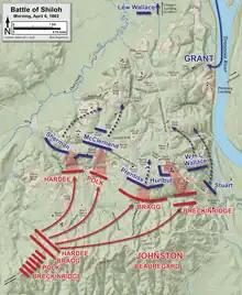 On February 8, 1862, after a Union victory at the Battle of Fort Henry and with the fall of Fort Donelson likely, Johnston ordered the abandonment of Kentucky, and Hindman's men withdrew to Corinth, Mississippi, via Murfreesboro, Tennessee. At Corinth, Johnston gathered forces and by April had over 40,000 men, and along with General P. G. T. Beauregard, began planning an attack against Major General Ulysses S. Grant's Union army at Pittsburg Landing, Tennessee.[76] Hindman was in command of a brigade in a corps led by Hardee.[77] Johnston's attack, known as the Battle of Shiloh, was launched on April 6.[78]