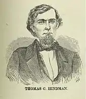 Throughout his political career, Hindman had supported slavery, the right of slaveholders to take their slaves to other territories, and the belief that the Union could only be preserved if slavery was allowed.[51] He also supported the resumption of the international slave trade, which had been outlawed in the United States.[52] In the election for Speaker of the United States House of Representatives in 1859, Hindman joined other southern Democrats in opposing the candidacy of Republican John Sherman. Sherman had signed a compendium accompanying an anti-slavery book by Hinton Rowan Helper, and in January 1860, Hindman made a speech titled "That Black Republican Bible – The Helper Book" in opposition to Sherman.[53] Hindman's speech was popular in the south, and Republican William Pennington was elected instead of Sherman.[54]