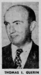 In 1954, Guerin joined the efforts James Tate and Michael J. Towey to weaken the civil service reforms of the new charter, but they were unsuccessful.[5] He was re-elected in 1955 with an increased majority.[6] The following year, he became ill with cancer. After an operation at Philadelphia's Hahnemann University Hospital, he died in his home at the age of 53.[2] Guerin's widow ran as an independent for his former seat on City Council in 1957, but lost to Democrat Emanuel Weinberg.[7]