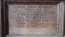 On 9 September 1856, Wethered married Edith Grace, a daughter of the Rev. Hart Ethelston, Rector of St Mark's, Cheetham Hill, Manchester.[8] Their eldest daughter, Edith Ethelston, married John Danvers Power, MVO, a barrister; their second daughter, Constance Anne Ellen, married William George Steuart-Menzies of Culdares, DL JP, of Arndilly House, Craigellachie, Banffshire.[13] Another daughter, Laura Sophia, married Francis William Grubbe.[14] Wethered died on 22 February 1921 at the age of 88, his widow on 1 September 1924.[8]