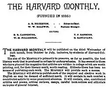 - ↑ Baldwin, WW, The Founding of the Harvard Monthly, Harvard Monthly, Vol. 21, October 1895