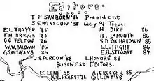 - ↑ Secretary, The Harvard Advocate, Harvard University, Editors of the Harvard Advocate 1866-1886, April 1886, p. 22.