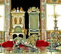 The Portuguese Throne room (pt. Sala do Trono) is in the Piano nobile of the Ajuda National Palace (Palácio Nacional da Ajuda) in Lisbon. The present decoration is from the 19th century, with walls covered with crimson velvet, gold gilded French mirrors and a major Tabriz carpet from the 18th century in the precious wood floor. The ceiling is covered with Máximo dos Reis allegorical fresco and a huge crystal chandelier.[4] The thrones are from Portuguese fabric, second half of the 18th century with the Portuguese coat of arms on the top handled by two angels. This fauteuils ware made to substitute the Juste-Aurèle Meissonnier’s throne made to John V of Portugal[5] and destroyed in the 1755 Lisbon earthquake. This throne was in Silver-gilt, with winged dragons, the heraldic symbolf of the House of Braganza, and the arms of Portugal supported by two allegorical statues, Europe and America. The Throne room is still used for state events of the Portuguese Republic.