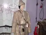 Tibetan herdsman's coat, fur-lined. A portable shrine for worship was carried with a shoulder strap. Field Museum of Natural History