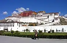 Standing at 117 meters in height and 360 meters in width, the Potala Palace, designated as a World Heritage Site in 1994 and extended to include the Norbulingka area in 2001, is considered a most important example of Tibetan architecture.[3] Formerly the residence of the Dalai Lamas, it contains over a thousand rooms within thirteen stories, and houses portraits of the past Dalai Lamas and statues of the Buddha. It is divided into the outer White Palace, which serves as the administrative quarters, and the inner Red Quarters, which houses the assembly hall of the Lamas, chapels, 10,000 shrines and a vast library of Buddhist scriptures.
