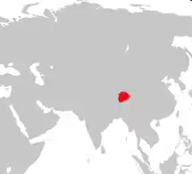 Tibetan red deer, along with Sichuan deer and Kansu red deer, forms the southern group of wapiti.[3] It lives in northern Bhutan and southern Tibet, where it is recorded from the Chumbi Valley close to Sikkim and from Lake Manasarovar. It was believed to be completely extinct until a small population was rediscovered in 1988 in Bhutan and southeastern Tibet. The original range probably covered many smaller valleys of the Brahmaputra River to the north of the Himalaya (Yarlung Tsangpo River).[2] A survey in 1995 brought the exciting finding, that a population of about 200 Tibetan red deer still persists to the north of the Yarlung Tsangpo River close to the village of Zhenqi. As this is the only known viable population of this deer, it is planned to establish a reserve for protection here. Evidence for some other relict populations has been found around the Subansiri River.[4]
