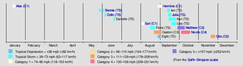 - ↑ The last storm, Otto, did not dissipate on November 25. It crossed into the Eastern Pacific, and because it was the final storm of the season, the crossover date is listed on here as the dissipation date.[1]