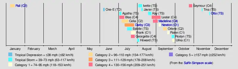 The 2016 Pacific hurricane season was an event in the annual cycle of tropical cyclone formation, in which tropical cyclones form in the eastern Pacific Ocean. The season officially started on May 15 in the eastern Pacific–east of 140°W–and on June 1 in the central Pacific–between the International Date Line and 140°W–and ended on November 30. These dates typically cover the period of each year when most tropical cyclones form in the eastern Pacific basin.[1] However the first storm, Pali, formed 5 months before the official start of the season on January 7, which broke the record for having the earliest forming storm within the basin.