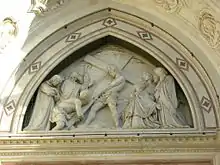 Sarrocchi worked for ten years with Giuseppe Partini to replicate the early 15th-century sculptures at Jacopo della Quercia's Fonte Gaia. The piece was inaugurated in 1869[3] with the original, weather-damaged work being moved to local hospital turned museum Santa Maria della Scala.[4] He would go on to complete several other restoration projects, working on Giovanni Pisano's sculptures in Pisa and again working with Partini on the restoration of Siena Cathedral.[3] He created façades for Basilica of Santa Croce.