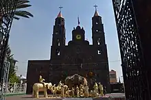 San Andrés Mixquic in the Mesoamerican period was also a dominion located on a small lake island. Its main landmark is its parish church, founded in 1537.[2] This church was built on top of a sanctuary for the goddess of life and death with archeological excavations finding many artifacts including a Chac Mool and two rings for a Mesoamerican ball court.[12] The original building was mostly destroyed in an earthquake and then rebuilt in 1600. The only remains from the first church is the bell tower, which is separate from the church building. In each of the town's named neighborhoods, there is a stone cross, which is the center of celebrations on May 3. The patron saint is honored on November 30, with processions. San Andrés Mixquis is known for its Day of the Dead celebrations which attract many visitors each year.[2][12]