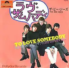 "To Love Somebody" is a song written by Barry and Robin Gibb. Produced by Robert Stigwood, it was the second single released by the Bee Gees from their international debut album, Bee Gees 1st, in 1967.[4] The single reached No. 17 in the United States and No. 41 in the United Kingdom. The song's B-side was "Close Another Door".[5] The single was reissued in 1980 on RSO Records with "How Can You Mend a Broken Heart" as its flipside. The song ranked at number 94 on NME magazine's "100 Best Tracks of the Sixties".[6] It was a minor hit in the UK and France. It reached the top 20 in the US. It reached the top 10 in Canada.