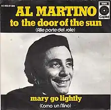 "To the Door of the Sun (Alle porte del sole)" is a 1975 hit single by Al Martino and the title track of his LP. It is the English version of an Italian-language song by Gigliola Cinquetti, "Alle porte del sole" (pronounced [alle ˈpɔrte del ˈsoːle]), which was released in 1973. Cinquetti had later recorded an English rendition of it, different from Martino's, which was released as a single by CBS Records in August 1974 with her original Italian version on the B-side; it reached number one in Argentina and number six in South Africa.[1] Cinquetti also recorded French- and Spanish-language versions of the song, respectively titled "Dernière histoire, premier amour" and "A las puertas del cielo".