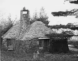 The Tom Thumb House is located south of the village center of Norfolk, on the south side of Windrow Road. It is set on a hillside above the road, from which it and an adjacent later house are screened by trees. It is a single-story structure, consisting of two roughly square sections joined at a corner. The walls of each section are made of large boulders, and are up to 2.5 feet (0.76 m) thick. The pyramidal roofs of each section, framed with hand-hewn timbers recycled from old barns, are covered in thick slate. One of the squares has the main living space, while the other houses a sleeping and kitchen area. Exposed framing and rough paneling, also recycled, are the principal exposed woodwork.[2]