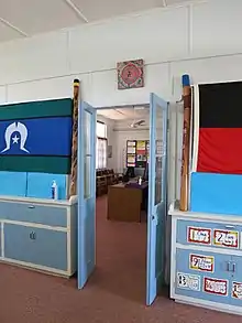 The building was soon extended. In September 1953, plans for a single classroom addition to the east of the 3-classroom building were drawn and the work subsequently performed. This addition matched the existing building and included a second staircase to the verandah.[68] In October 1955, plans were drawn for two more classrooms to be added to the east of the previous addition. These were built sometime in 1956 and were slightly different to the earlier classrooms. Windows in the southern walls were awning windows instead of casements; external cladding extended to ground level on the south and east sides, forming a semi-enclosed play space beneath; bag racks were built instead of verandah balustrades; and instead of a hat room, the east end of the verandah was enclosed with a glazed screen.[69][70][1]
