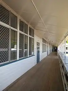 Enrolments at Toowoomba North State School grew to such an extent that in September 1951 approval was given for a three-classroom building to be erected to the west of the existing school building.[62][63] From 1950 the Department of Public Instruction introduced and developed new standard plans for school buildings. These buildings were generally high-set timber-framed structures and the understorey was used as covered play space. Introduced in 1950, the principal type was a long and narrow building with a gable roof. Stairs were often semi-enclosed, connecting the understorey to a north facing verandah running the length of the building. Classrooms opened off the verandah and had extensive areas of windows; almost the entirety of the verandah wall and the opposite classroom wall were glazed, allowing abundant natural light and ventilation. This type was the most commonly constructed in the 1950s in Queensland.[64][1]