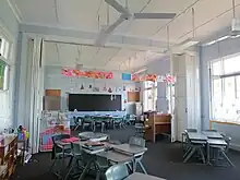The interior layout is approximately symmetrical, with classrooms arranged along the southern side of the building connected by corridors along the north side. Originally comprising the manual training rooms, boys' toilets and play space in the undercroft; five classrooms, domestic science rooms, entrance hall, two teachers rooms, girls toilets and a store room on the first floor; and seven (later nine) classrooms and two teachers rooms on the second floor, the layout of the building remains generally intact. Alterations to the layout include the removal of original folding partitions between classrooms, resulting in some double-sized rooms, and the insertion of partitions in places. The manual training room and domestic science rooms, located at the eastern end of the building, have been converted into classrooms. The first floor corridor has been extended to run the full length of the building; the location of former walls is indicated by changes in the floor surface and small bulkheads across the ceiling. Former cloakrooms, located adjacent to the internal staircases, have been converted for use as staff rooms or other functional spaces.[1]