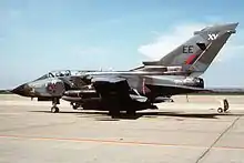 In 1983, the squadron exchanged their twelve Buccaneer S2s for the same number of Tornado GR.1s, for use in a similar role from early 1984.[13] Because of the UK's commitment to SACEUR, this involved the use of the "Designate" process whereby a Tornado squadron was formed and worked up at Honington and once operational moved to Laarbruch and assumed the No.15 Squadron identity from the Buccaneer unit. This made the squadron the first Tornado unit in Germany - a force that would grow to eight squadrons - and remained in the nuclear delivery role for SACEUR with an increased allocation of 18 weapons owing to the Tornado's ability to carry two bombs. The squadron's nuclear delivery role assigned to SACEUR continued at this strength until 1991, when it disbanded.