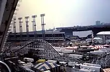 The now vanished "Flyer" rollercoaster, and the likewise vanished Exhibition Stadium at the CNE in 1985, as seen from the giant Ferris wheel