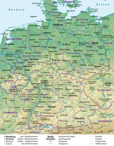 - in the east: Saxon Switzerland, Thuringian Forest, Ore Mountains and the Elbe Valley
