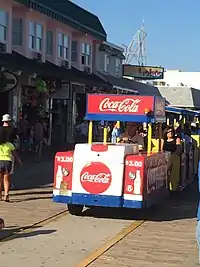 The Sightseers Tram Car (commonly referred to as the Tramcar) is a trackless train service running on the Boardwalk in the Cape May County, New Jersey communities of Wildwood and North Wildwood.[2] The service, which began on June 11, 1949,[3] takes passengers along the two-mile long Wildwood Boardwalk. Service is available at all points along the boardwalk, from the beginning at Cresse Avenue to the end at 16th Avenue in North Wildwood.