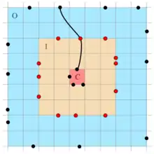For each cell , a set of access nodes can be found by looking at an inner area of 5x5 cells and an outer area of 9x9 cells around . Focusing on crossing nodes (ends of edges that cross the boundary of , or ), the access nodes for are those nodes of that are part of a shortest path from some node in to a node in . As access nodes for an arbitrary node all access nodes of are chosen (red dots in the image to the right).