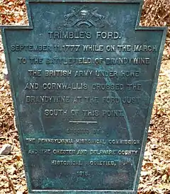 During the Battle of Brandywine on September 11, 1777, more than twelve thousand British troops under Generals William Howe and Charles Cornwallis crossed the west branch of the Brandywine at Trimble's Ford. The troops began the flanking maneuver in Kennett Square, made their first crossing at Trimble's Ford,[3] then crossed the east branch at Jefferis Ford,[4] before engaging the American troops near Birmingham Friends Meetinghouse.[5]