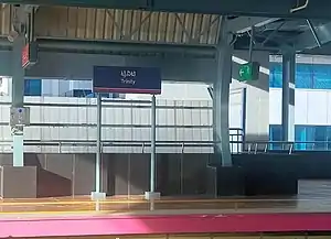 Trinity is an elevated metro station on the East-West corridor of the Purple Line of Namma Metro in Bangalore, India.[3] It was opened to the public on 20 October 2011.[4] The station was constructed by Punj Lloyd.[5]