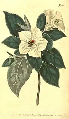 The St. Helena Redwood was used as an early example of ex situ conservation when the governor of St. Helena obtained a couple seedlings and planted them in his garden.[3] It now exists in cultivation, although cultivated stock is weak. This species has pendant flowers, petals that turn pink with age, and white staminodes.