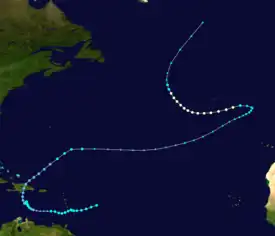 The 1970 Caribbean–Azores hurricane was an unnamed Atlantic hurricane that became the wettest known tropical cyclone to affect the United States territory of Puerto Rico on record.[1] The long-lived system formed on September 24 just off the west coast of Africa, and for several days maintained a general westward track. It passed through the Lesser Antilles on October 1, and later stalled in the eastern Caribbean Sea. On October 8, the depression crossed over the Dominican Republic, and subsequently it accelerated to the northeast. It was declassified as a tropical cyclone on October 12, although its remnants persisted for another week before dissipating in the westerlies near the Azores.
