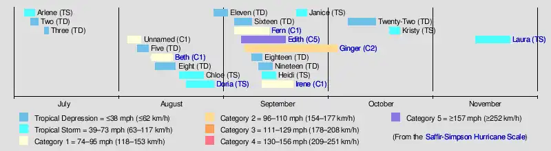 Hurricane Edith, the strongest storm of the season, developed from a tropical wave on September 5 to the east of the southern Lesser Antilles. It moved quickly across the southern Caribbean Sea, intensifying into a hurricane just off the north coast of South America. Edith rapidly intensified on September 9 and made landfall on Cape Gracias a Dios as a Category 5 hurricane on the Saffir-Simpson Hurricane Scale. It quickly lost intensity over Central America and after briefly entering the Gulf of Honduras it crossed the Yucatán Peninsula in Mexico. After moving across the Gulf of Mexico, a trough turned the storm to the northeast and Edith, after having restrengthened while accelerating towards the coast, made landfall on Louisiana with winds of 105 mph (170 km/h) on September 16. Edith steadily weakened over land and dissipated over Georgia on September 18.[4]