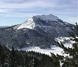 Two Ocean Mountain is the northernmost peak of the Wind River Range which is a subrange of the Rocky Mountains.[4] It is set along the Continental Divide, one mile southwest of Togwotee Pass, on land managed by Bridger-Teton National Forest. The nearest towns are Jackson 39 miles (63 km) to the southwest and Dubois, 27 miles (43 km) to the southeast. Precipitation runoff from the mountain drains east into headwaters of the Wind River and ultimately the Atlantic Ocean, whereas the west slope drains into tributaries of the Snake River and ultimately the Pacific Ocean. The east slope of the mountain is the source of the Wind River and topographic relief is modest as the summit rises 1,400 feet (430 meters) above the river in 1.25 mile (2 km).[5] Two Ocean Mountain can be seen from the Wyoming Centennial Scenic Byway which provides year-round access to the mountain except during blizzards.[2] The mountain was called "the Two Ocean Mountain winter sports area" in the mid-1900s.[6] The mountain's toponym has been officially adopted by the United States Board on Geographic Names.[3]