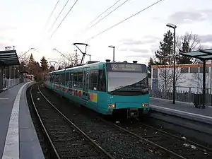 Since the end of 2012, two different types of vehicles have been used on the A line, the U4 and U5 railcars. The vehicles are each 2.65 meters wide. The Frankfurt underground is normal gauge (1435 mm gauge) and runs with 600 V DC, which is supplied via a catenary. The U4 series was built by DUEWAG and Siemens, the U5 series by Bombardier Transportation.