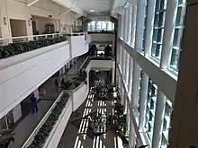 It also has multiple garden terraces and floor-to-ceiling windows in every patient room to create a more soothing and natural environment for healing. Hospital fare has also been upgraded. Patients order meals through a room service attendant who provides a personalized menu of local fare selected and crafted by executive chef Rodney Fry.[18] Meals can also be ordered at The Cove at Thornton Pavilion.[20] Additionally, each hospital room is equipped with an iPad and Apple TV for patients to control lighting, temperature, and entertainment.[21] Patients can download apps and stream their content to the Apple TV, and will also be able to contact their care team and view patient records through an Epic Systems application, administered through Jamf infrastructure. Patients create unique passcodes for their iPads, which are digitally and literally sterilized at the end of their stay.[22]