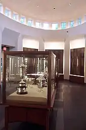 The oval rotunda, illuminated by a clerestory, houses all 13 USGA national championship trophies, while the names of every USGA champion, such as eight-time winners Bobby Jones and Tiger Woods, are inscribed on bronze panels that encircle the room.