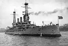 New Hampshire was laid down on 1 May 1905 at the New York Shipbuilding Corporation in Camden, New Jersey. She was launched on 30 June 1906. The ship was commissioned into the US Navy on 19 March 1908; her first commander was Captain Cameron Winslow. After completing final fitting-out work, New Hampshire transported a Marine Expeditionary Regiment to Colón, Panama on 20 June, arriving six days later. She then made a series of visits to ports on the eastern coast of North America, including Portsmouth, New York, and Bridgeport, along with a stop in the Canadian province of Quebec. The ship was then overhauled in New York, followed by training exercises in the Caribbean Sea. On 22 February 1909, she participated in a Naval Review for President Theodore Roosevelt to greet the return of the Great White Fleet in Hampton Roads, Virginia.[3] During this period, Ernest King, later the Chief of Naval Operations during World War II, served aboard the ship in the engine room.[4]