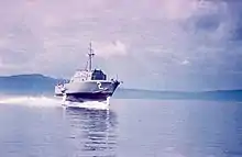 The USS Tucumcari (PGH-2) was a Boeing-built hydrofoil. Named after Tucumcari, New Mexico, it was the basis for the technology used in the subsequent Pegasus-class patrol boats and the Jetfoil ferries. Its unique feature was a waterjet propulsion and a computer-controlled fully submerged foil configuration of one foil at the bow and foils on the port and starboard sides. The Tucumcari was one of two prototype boats contracted by the Navy under project SCB 252[1] for the purpose of evaluating the latest hydrofoil technology. The second boat was the rival Grumman-built USS Flagstaff (PGH-1).