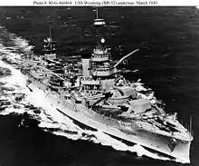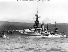 USS Wyoming (BB-32) was the lead ship of her class of dreadnought battleships and was the third ship of the United States Navy named Wyoming, although she was only the second named in honor of the 44th state.[lower-alpha 1] Wyoming was laid down at the William Cramp & Sons in Philadelphia in February 1910, was launched in May 1911, and was completed in September 1912. She was armed with a main battery of twelve 12-inch (305 mm) guns and capable of a top speed of 20.5 kn (38.0 km/h; 23.6 mph).