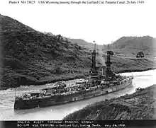 On 1 February, Wyoming steamed out of New York to join the annual fleet maneuvers off Cuba, before returning to New York on 14 April. On 12 May, she left port to help guide a group of Navy Curtiss NC flying boats as they made the first aerial transatlantic crossing. The battleship was back in port by 31 May. She then took on a crew of midshipmen for a training cruise off the Chesapeake Bay and Virginia Capes. After finishing the cruise, Wyoming entered dry dock at the Norfolk Navy Yard on 1 July for a modernization for service in the Pacific.[2] Her secondary battery was reduced to sixteen 5-inch guns.[9] After emerging from the shipyard, she became the flagship of BatDiv 6 of the newly designated Pacific Fleet. On 19 July, Wyoming and the rest of the Pacific Fleet departed the east coast, bound for the Pacific. The ships transited the Panama Canal later that month, and reached San Diego, California on 6 August.[2]