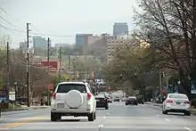Within Atlanta, US 19/US 41 runs along Northside Drive where it is joined by US 29/SR 3 Connector (Chapel Street Southwest). From there, US 9/US 29/US 41/SR 3 runs north and then curves northeast, passing by a group of condominiums called "The Villages of Castleberry Hill", before the road curves straight north between Nelson Street Southwest and Markham Street Southwest. Here, the routes run along the west side of Mercedes-Benz Stadium next door to the Georgia World Congress Center. US 29 leaves the concurrency with US 19/US 41 in the vicinity of Georgia Tech and turns northwest onto US 78/US 278/SR 8, which leaves US 9/US 41 to go west. The highway briefly curves northeast as it passes over some Norfolk Southern Railway lines, then turns north again at a partial interchange with Tech Parkway Northwest. Leaving the vicinity of Georgia Tech, it splits from US 41/SR 3 after traveling through Downtown Atlanta and turns right onto on 14th Street, which is also the western beginning of SR 9. One block after the interchange with Interstate 75 (I-75)/I-85 (Downtown Connector) in Midtown, it has an intersection with a one-way pair with Spring Street (southbound US 9) before turning north on Peachtree Street. The one-way pair ends at the vicinity of a complex interchange with SR 13 and the Savannah College of Art and Design Atlanta Campus, just south of a crossing over I-85, which includes historic Peachtree station. After several miles, it intersects SR 141 in Buckhead, where Peachtree Street continues. It follows Roswell Road north through the city of Sandy Springs. At its southern interchange with I-285, it splits from SR 9, and overlaps I-285 between exits 25 and 27, the latter of which is for SR 400, which it overlaps north of there.