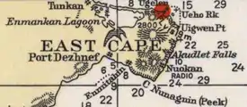 Uelen (Russian: Уэлéн; Chukchi: Увэлен, Uvèlèn; Siberian Yupik: Улыӄ, Ulyḳ; Naukan Yupik: Олыӄ, Oleq; [9] Iñupiaq: Ualeq[10]; also known as Whalen in older English-language sources and Ugelen on United States Coast and Geodetic Survey charts) is a rural locality (a selo) in Chukotsky District, just south of the Arctic Circle in Chukotka Autonomous Okrug in the Russian Far East. As of the 2010 Census, its population was 720.[2][3] Located near Cape Dezhnev where the Bering Sea meets the Chukchi Sea, it is the easternmost settlement in Russia and the whole of Asia. It is located in the Western Hemisphere, but the International Date Line curves around it, so it remains in a Russian time zone (UTC+12:00). Uelen is also the closest Asian settlement to North America. It is on the northeast corner of the Uelen Lagoon, a roughly 15 by 3 kilometres (9 by 2 miles) east-west lagoon separated from the ocean by a sandspit. Municipally, Uelen is subordinated to Chukotsky Municipal District and is incorporated as Uelen Rural Settlement.[5]
