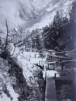 Uncle Tom's Trail was a steep stairway descent from the south rim of the Grand Canyon of the Yellowstone to a viewpoint near the base of the Lower Yellowstone Falls in Yellowstone National Park.[1] The trail was constructed in 1898 by park concessionaire, "Uncle Tom" H. F. Richardson when the Department of the Interior granted Richardson a permit to operate a ferry across the Yellowstone River. He ferried park visitors across the Yellowstone River above the current site of the Chittenden Memorial Bridge then escorted them to the trail and they traveled down to the base of the Lower Falls via ladders and ropes. Upon their return, visitors were provided a picnic lunch on the south rim of the canyon before returning via the ferry. In 1903 when the original Chittenden Bridge was built, Richardson's ferry business began to decline. In 1905, when the government built a wooden stairway, visitors were increasingly unwilling to pay Richardson the $1 fee for the tour to the base of the falls. 1906 was the last year he operated tours in the canyon.[2]